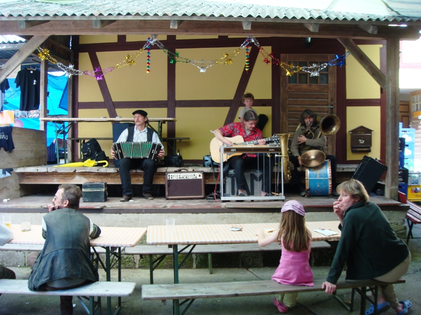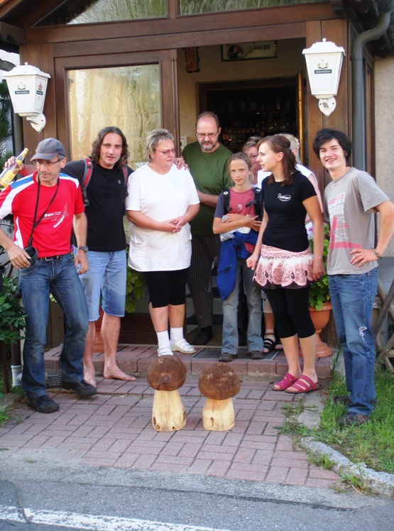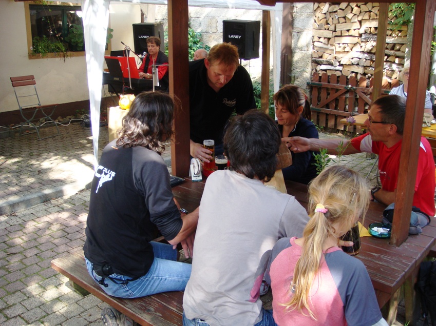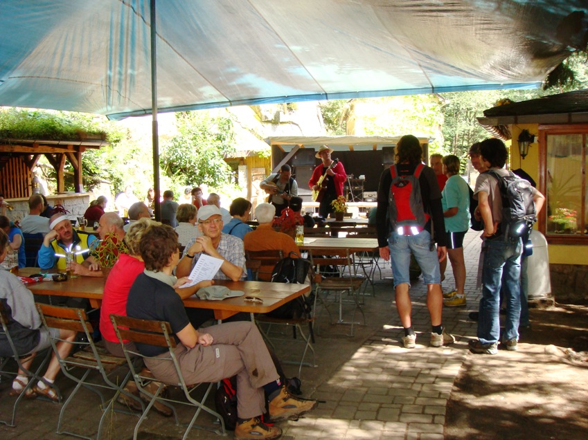 Dort erfreute ein dynamisches Gesangesduo mit orginellen Texten unser Ohr und nach nur 2 Bieren ging es weiter zur Felsenmühle. Hier servierten zwei tschechische Künstler den Ohrenschmaus, die wir so witzig fanden, dass wir sie sofort für unser nächstes Vereinstreffen verpflichten wollten, sie waren auch nicht abgeneigt, mal schauen was daraus wird. Auch dort gab es Bier und wieder nicht nur eins, so dass Stimmung bereits auf dem Höhepunkt war, jedenfalls bei uns. So ersteigerten wir zwei große handgeschnitzte Holzpilze, die wir unseren Wirtsleuten in Mittelndorf schenken wollten...