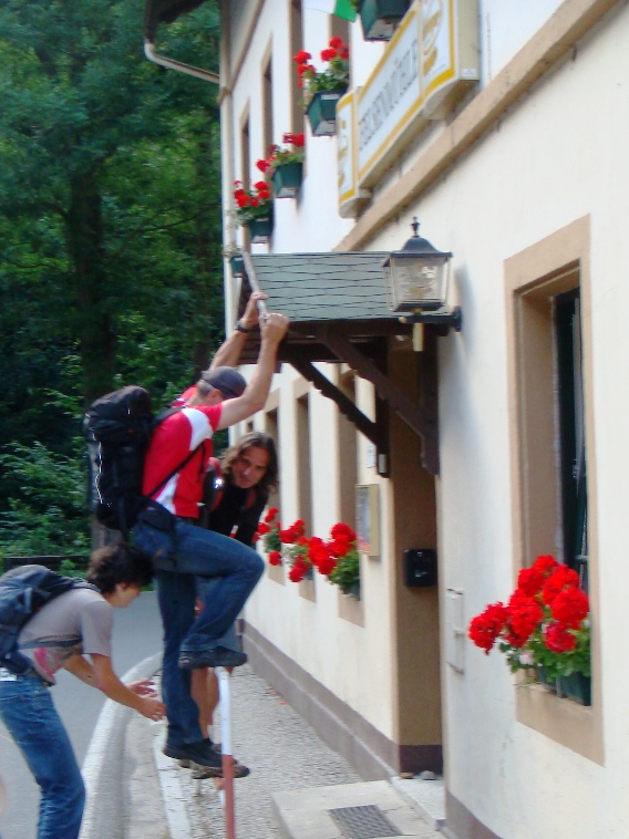 ...und mussten auch unsere Kletterfähigkeiten mit hmzig,ähm Promille im Blut unter Beweis stellen. Hier versucht sich ein Bergsportfreund am Dach zum Eingang der Felsenmühlen, Alter Weg III, jedoch ohne Unterstützung VIIb. Aus diesem Grund wird bereits die Baustelle eingerichet. Das ganze Unternehmen scheiterte letztlich am fehlenden Gleichgewichtssinn der Protagonisten und wir setzten unseren Weg in Richtung Lichtenhainer Mühle (Lichtenhainer Wasserfall) fort. Kenner wissen das Forsthaus zu schäzen, wir natürlich auch. Mit den Damen der Außenversorgung gerieten wir nach Anfangs sehr sehr netten Unterhaltungen ein wenig in Streit darüber, wie groß der Aufwand sein sollte, die große fettige Pfanne zu waschen.