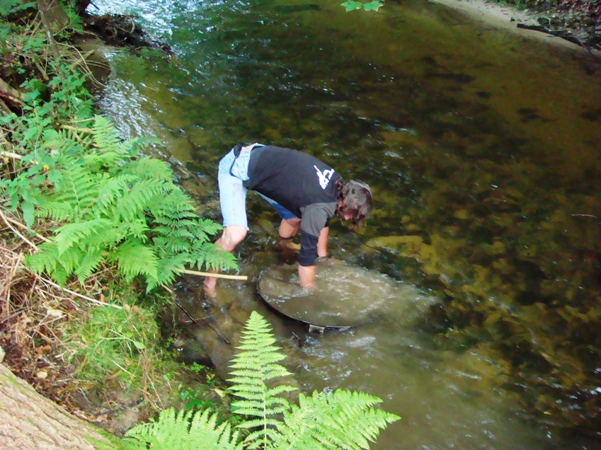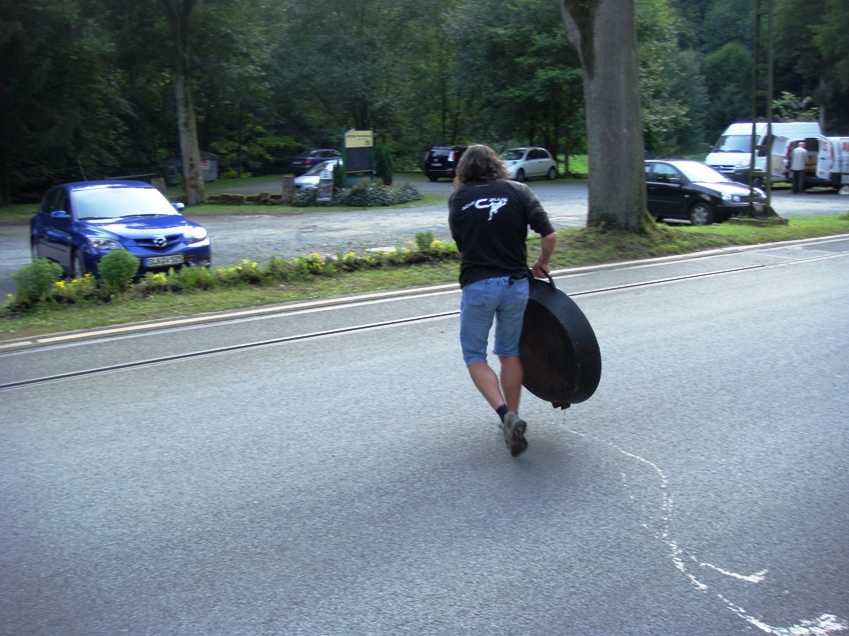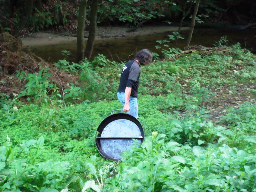 Nach dem von den Damen ein Bier und eine Schweinshaxe gratis in Aussicht gestellt wurde, wenn sich nur ein Idiot finden würde, der das Teil in der Kirnitzsch reinigt, war ich auch schon mit der Pfanne unterwegs. Nicht nur gefühlte 83 kg, sondern auch die extreme Unhandlichkeit und möglicherweise auch der zuvor üppige Biergenuss ließen das Unternehmen zu einem echten Abenteuer werden.