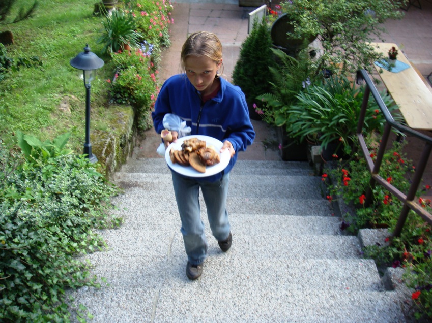 unseren Geschenken aufwarteten. Mit sanfter Gewalt mussten wir sie zu diesem Gruppenbild zwingen. Die beiden Pilze haben übrigens einen würdigen Platz im Foyer des Eingangs