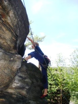 Johannes hat es geschafft, wie auf dem rechten Bild zu sehen und Johanna (Krümel) steigt hinterher. Wir finden ein sehr festes Gestein vor, wie im Bielatal üblich und es geht an gutgriffigen Rippen steil nach oben. Auf den zahlreichen kleinen Bändern steht man immer gut und kommt auch mit vielen kleinen Schritten nach oben, was diesen Weg zu einem sehr guten Kinderweg macht.
