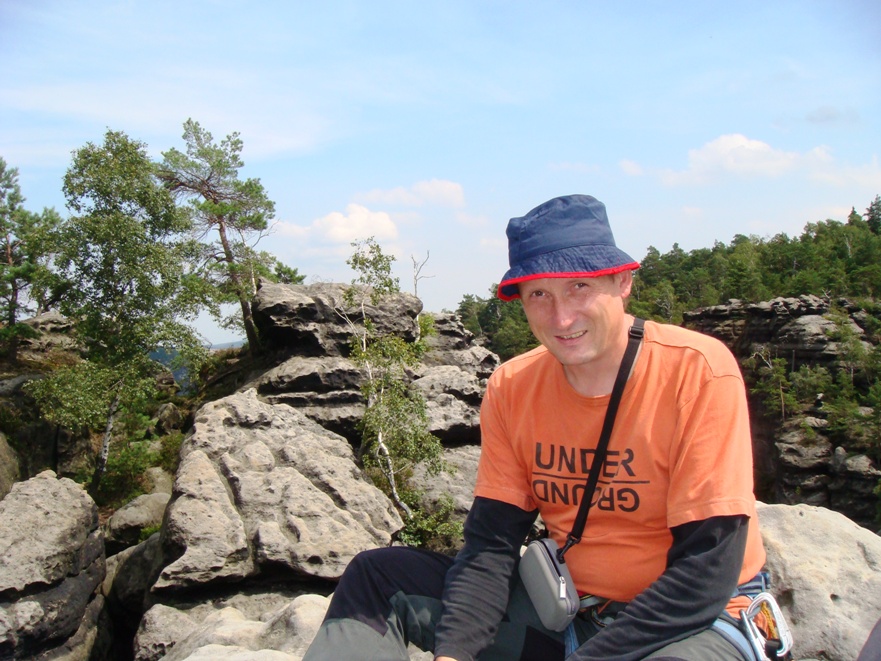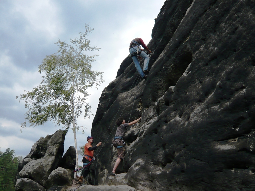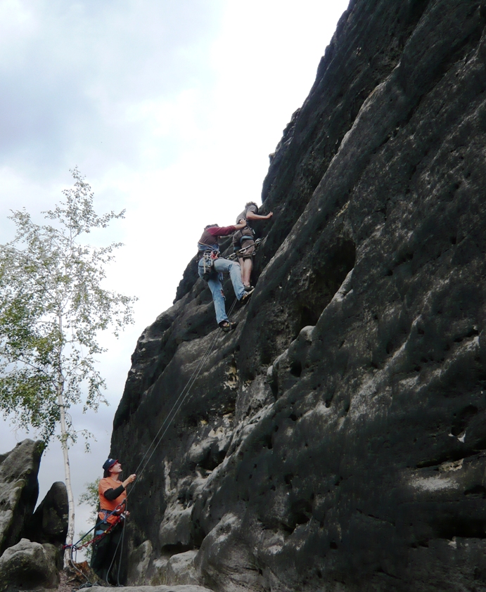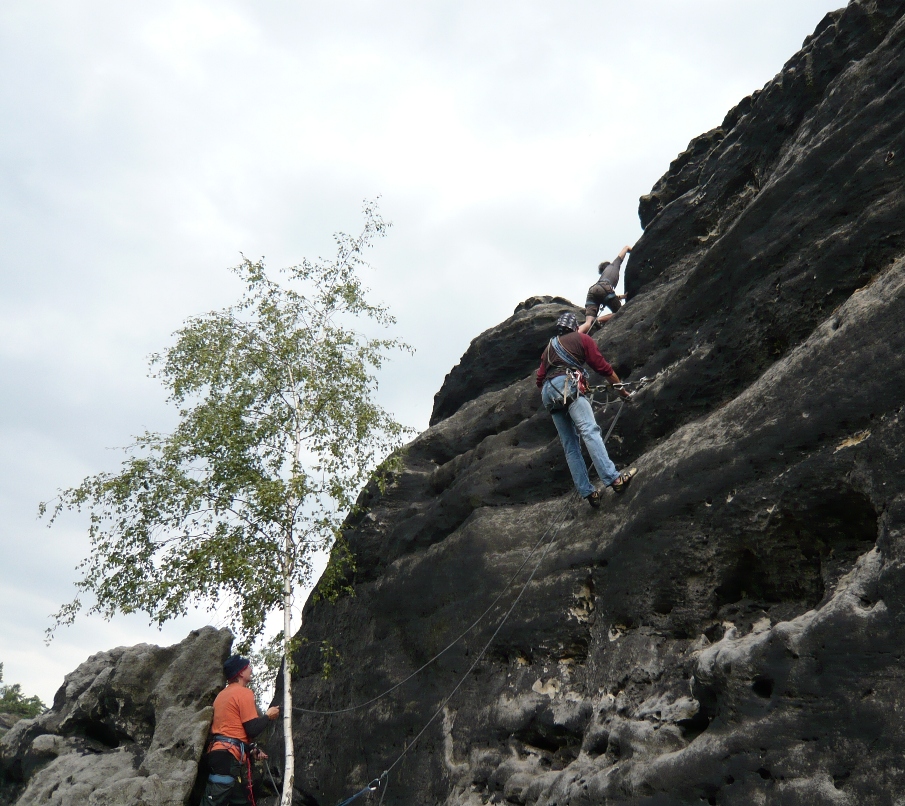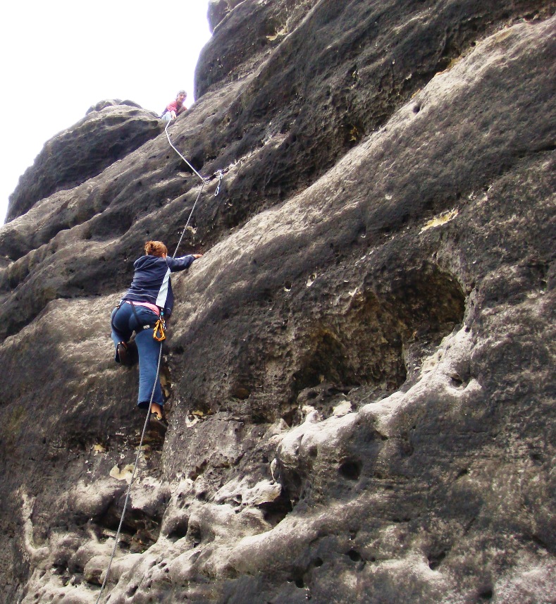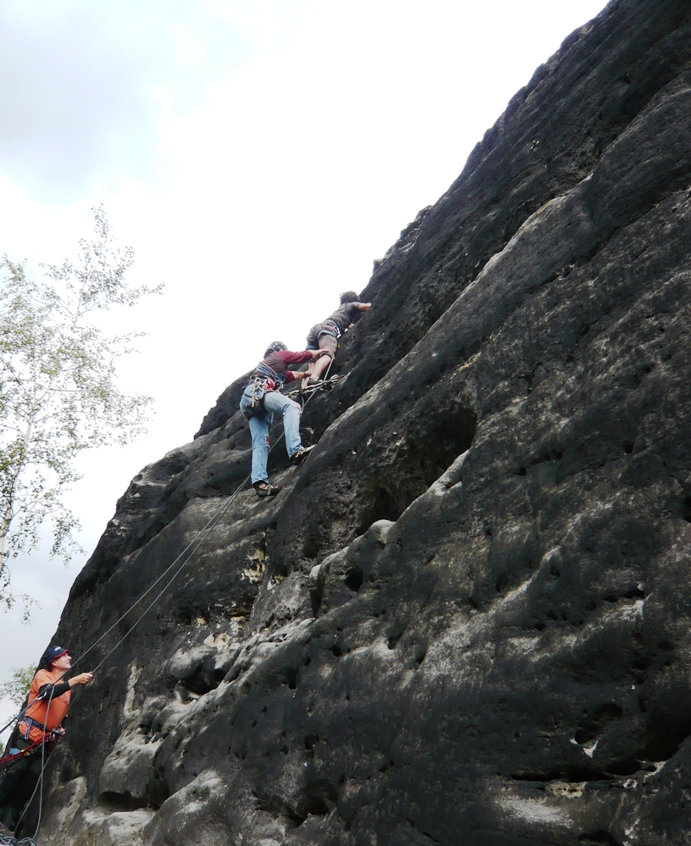 Zum Glück waren wir allein an den Pechofensteinen. Wie auf dem Bild rechts zu sehen, habe ich die schwere Stelle mit anschließender Querung gekniffen