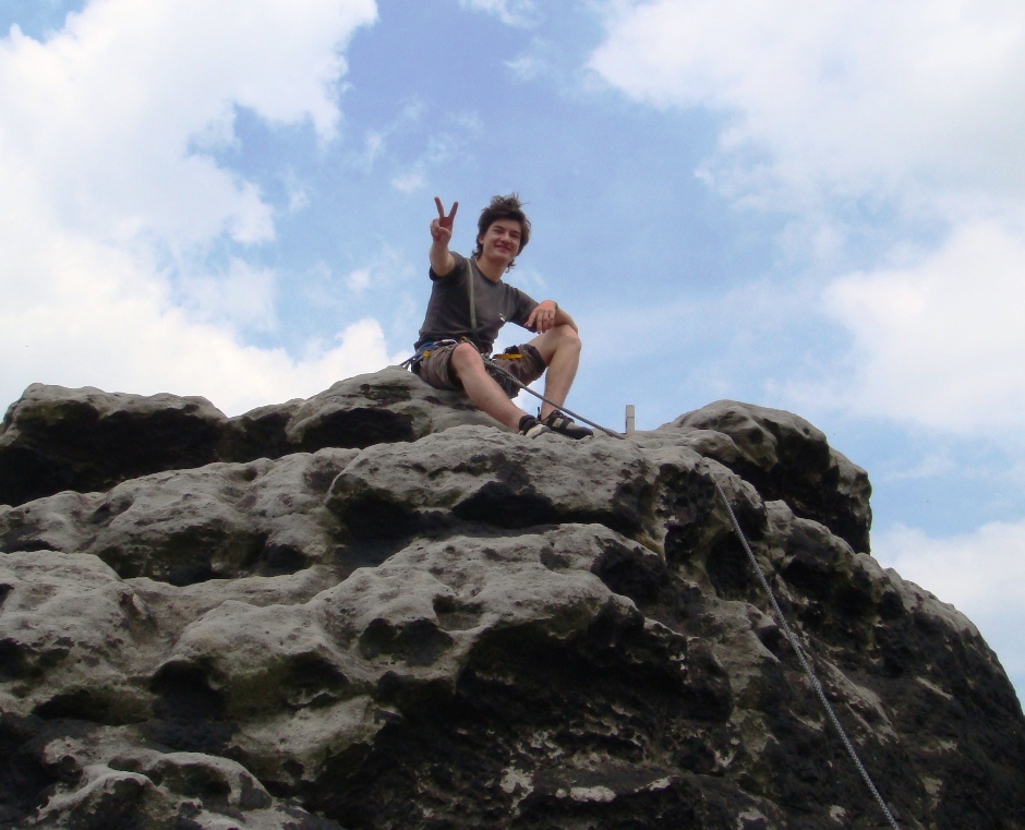 Aber unser Held des Tages tront auf dem Gipfel und genauso, wie seine Haare durcheinander sind, waren seine Nerven es auch. Wir waren schon längst alle abgeseilt,